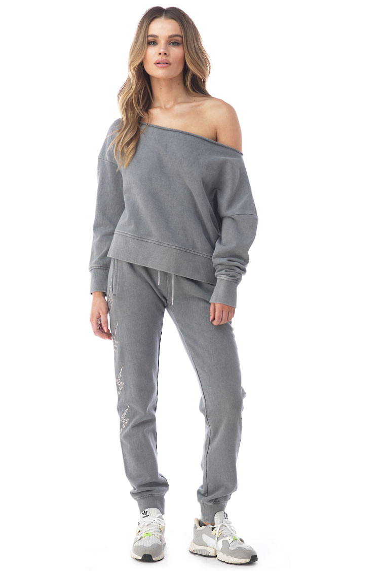 Distressed joggers made from heavy French terry with a vintage wash, featuring embroidered lightning bolts and elastic cuffs for a relaxed, lived-in look.